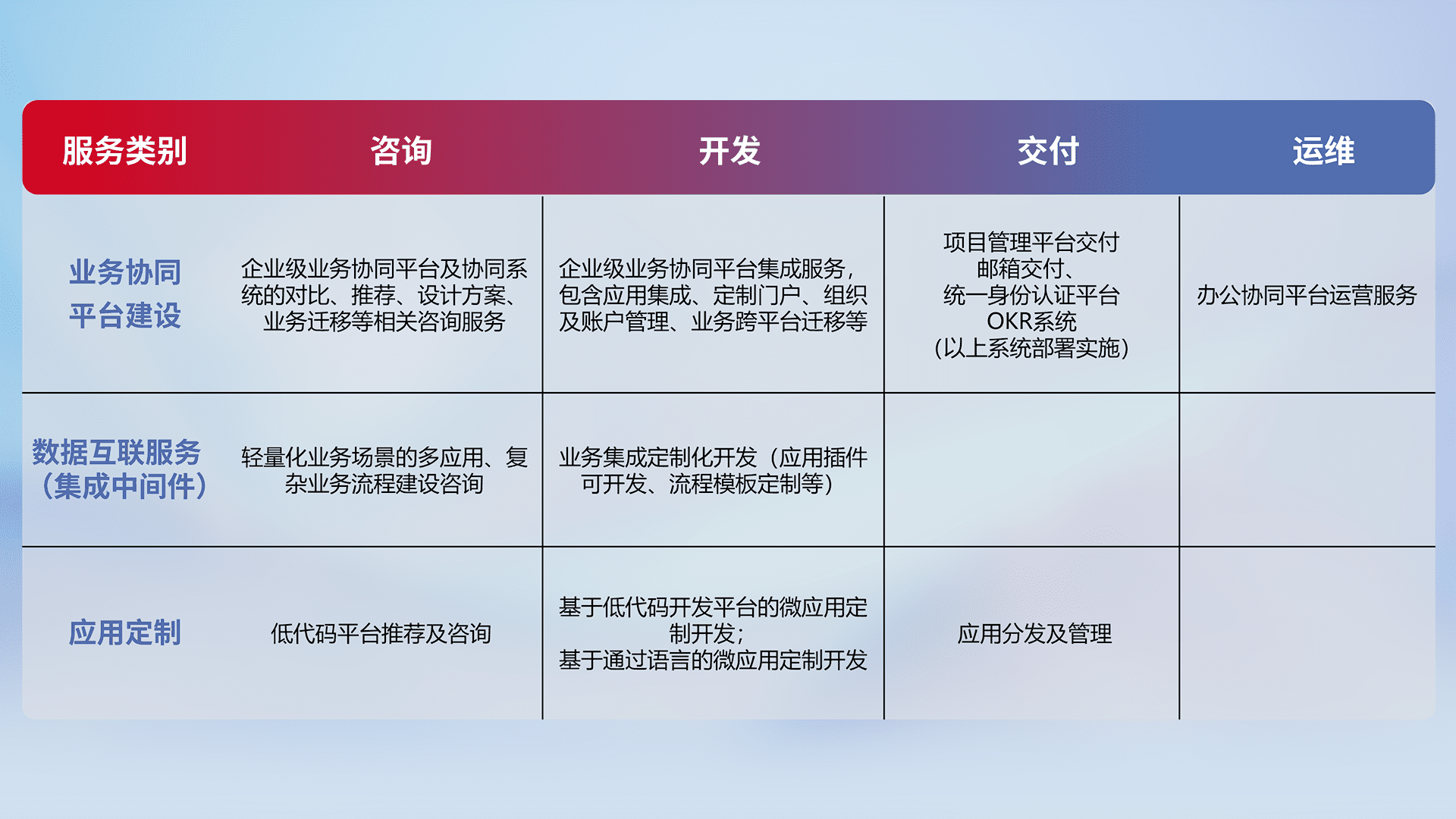 针对钉钉、、、、企微、、、IDaas等平台级产品提供产品的规划、、、、方案、、、交付、、定制化开发等服务,,,,实现如统一协同办公、、智能客户服务、、、、混合会议管理、、、智能数据查询、、、等业务场景,,实现数字化转型。。。。